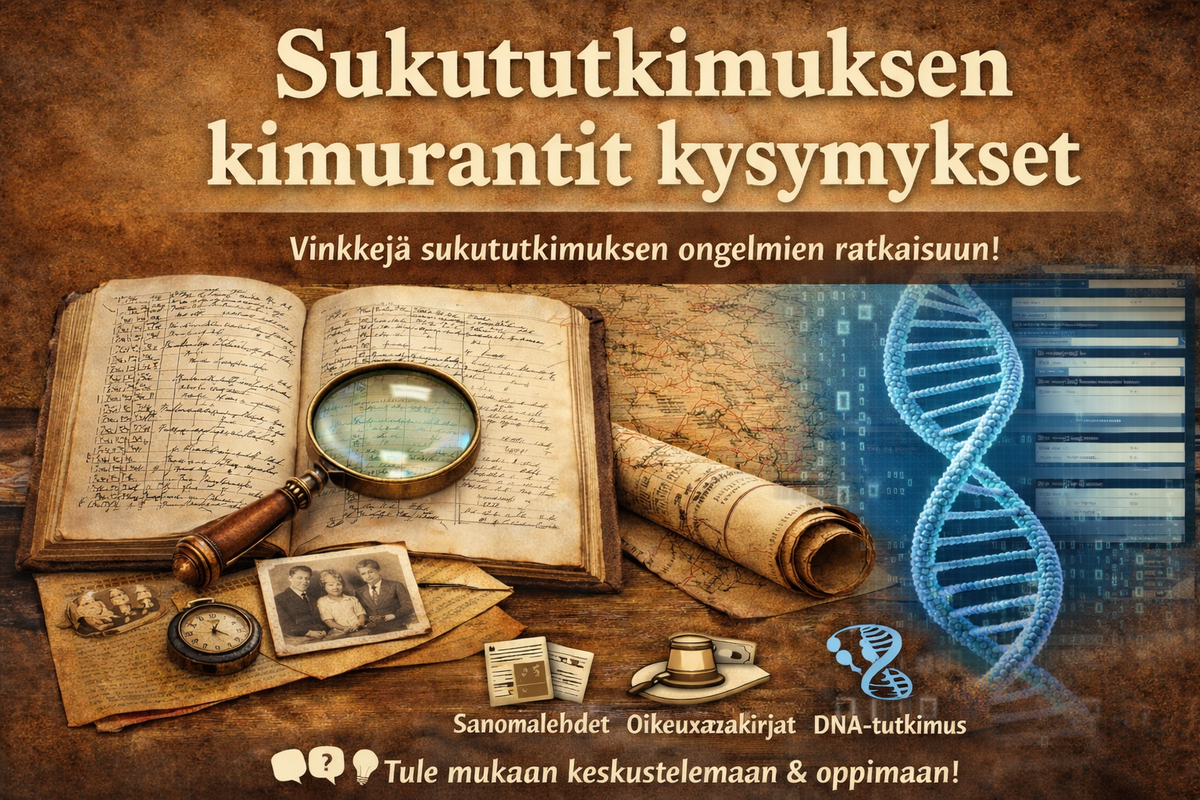 Miten edetä, kun lähteet ovat ristiriitaisia tai tutkimus jumittuu? Keskustelutilaisuudessa jaetaan vinkkejä sukututkimuksen ongelmatilanteiden ratkaisemiseen ja tutustutaan erilaisiin aineistoihin kirkonkirjoista digitaalisiin tietokantoihin ja DNA-tutkimukseen. Tule mukaan kysymään, keskustelemaan ja oppimaan – kimurantit kysymykset tekevät sukututkimuksesta kiinnostavaa!